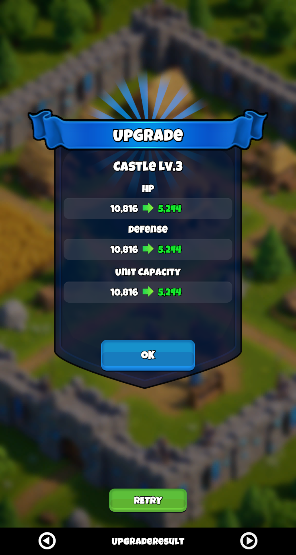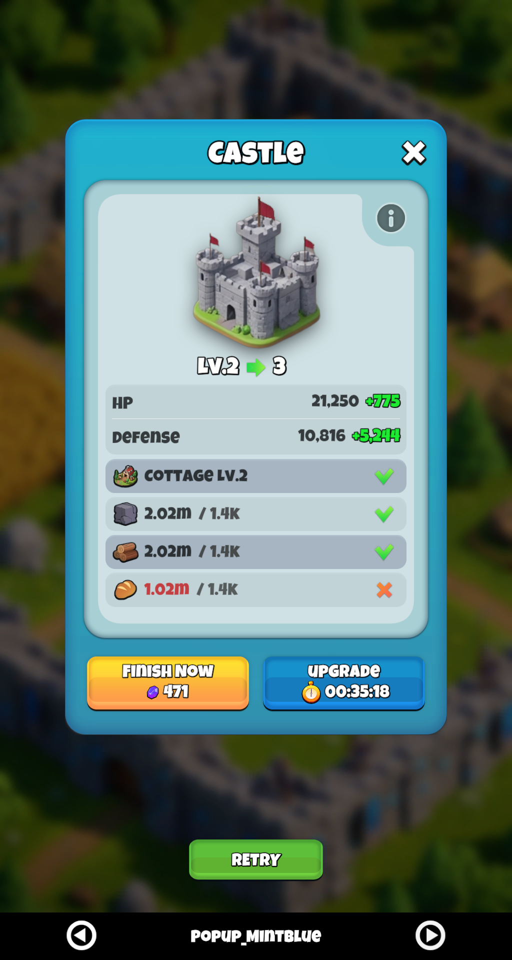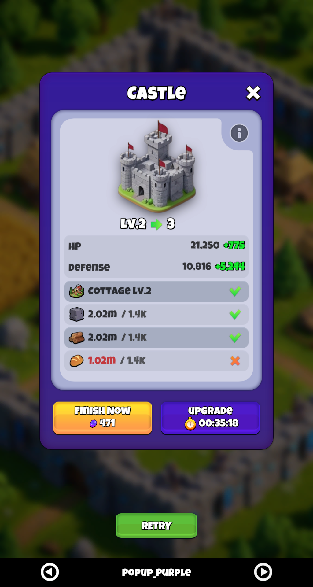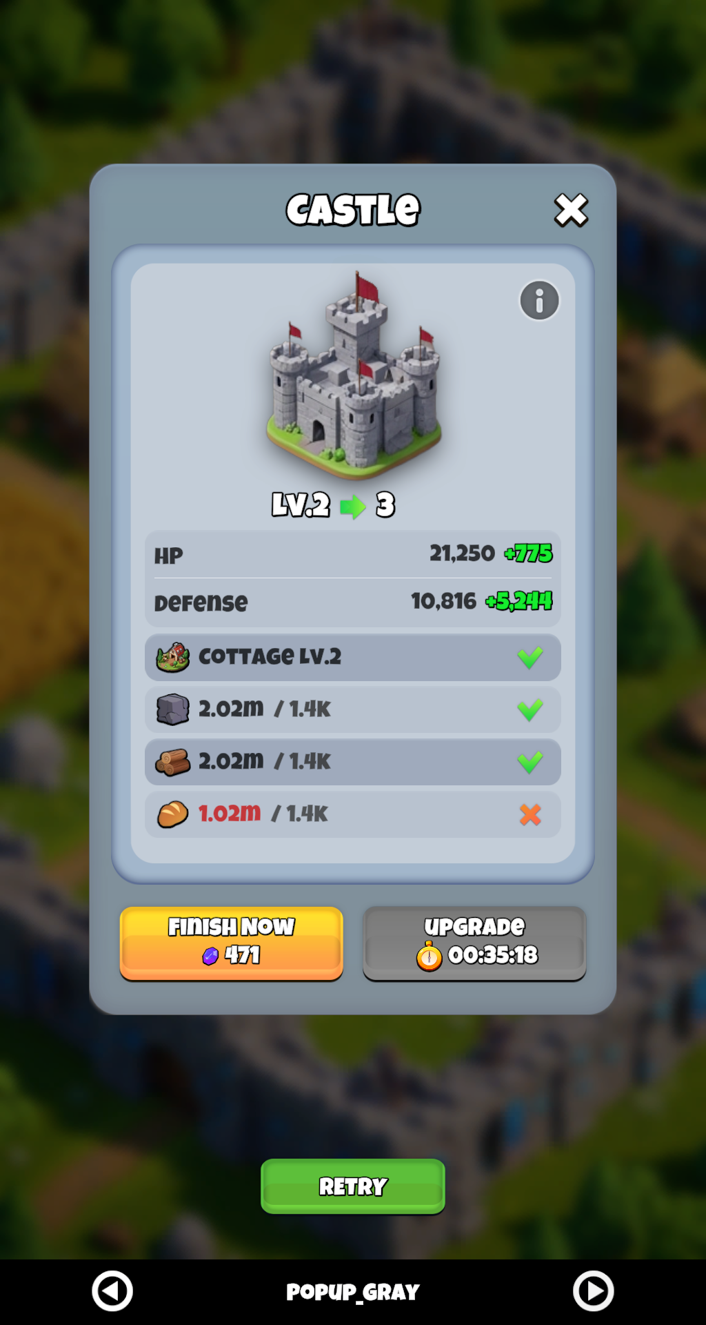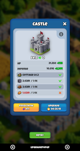 | Upgrade Popup | Side-by-side stat comparison, progress bar, Finish Now & Upgrade buttons. |