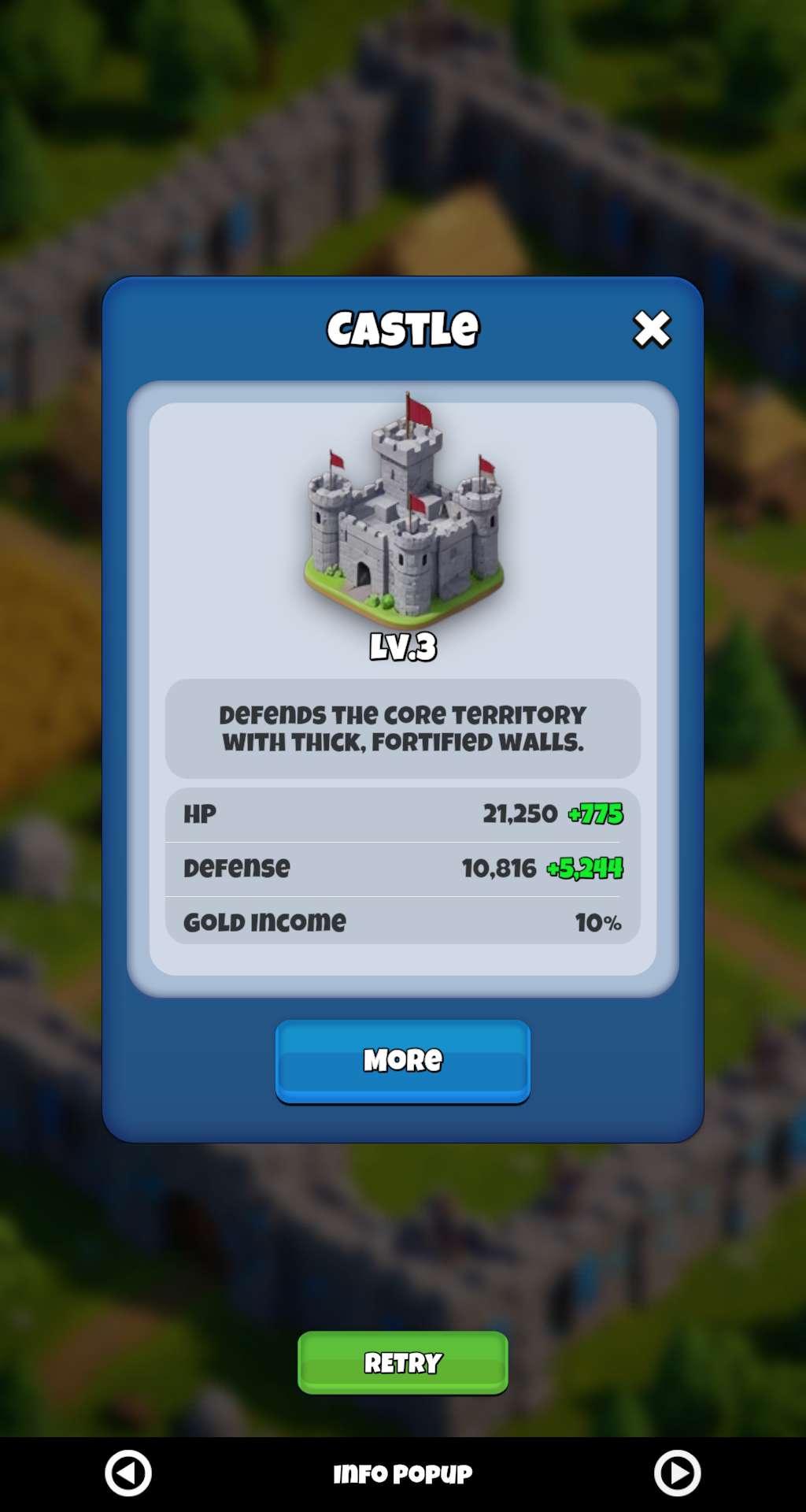 | Info Popup | Building detail view with icon, description, and stats. |